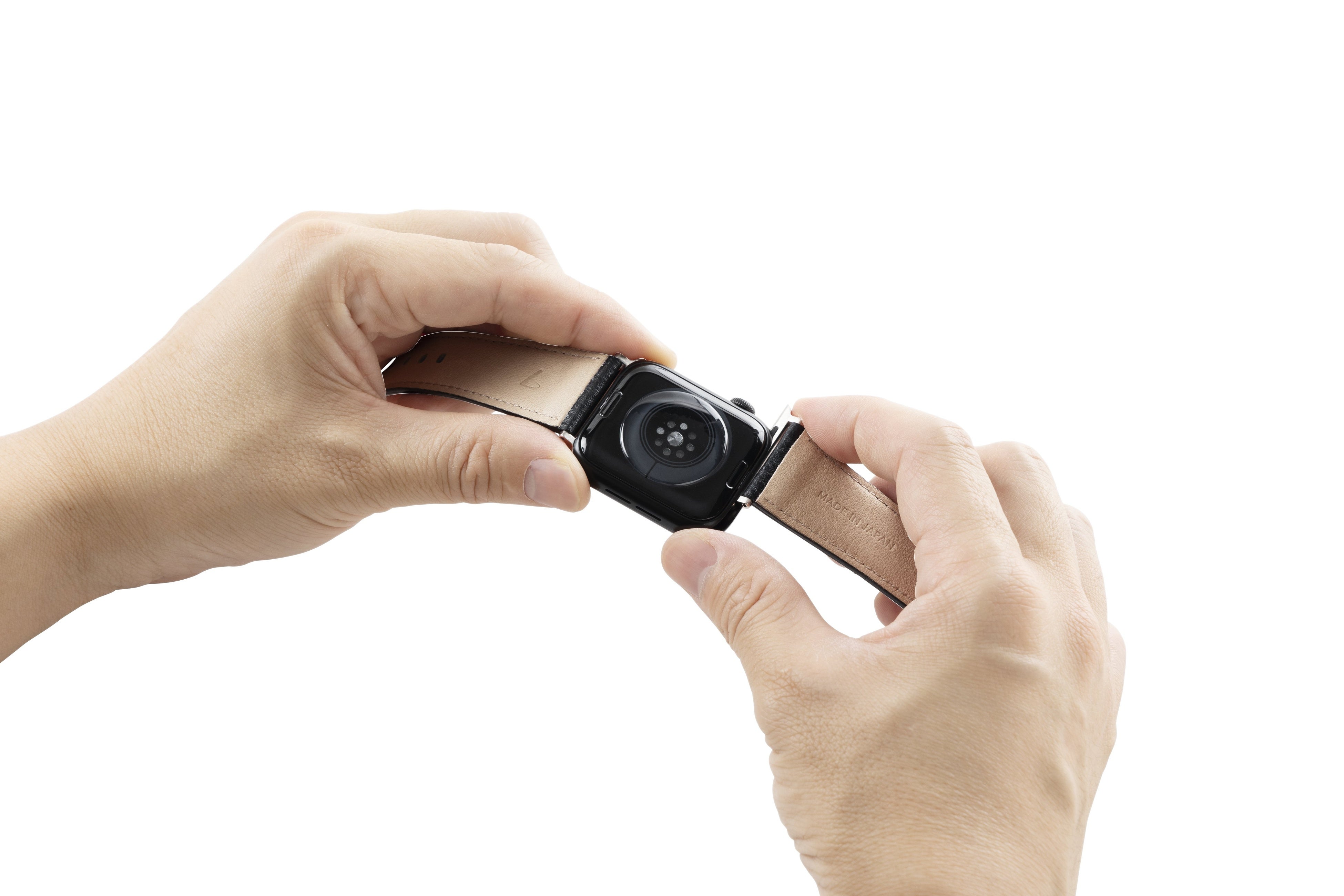 Apple Watch42・44・45mm用と38・40・41mm用の2タイプを展開。長さは男女問わずお使いいただけるよう、9段階で調整可能です。挿し込みながらスライドさせるだけで、簡単に装着・脱着できるようになっています。