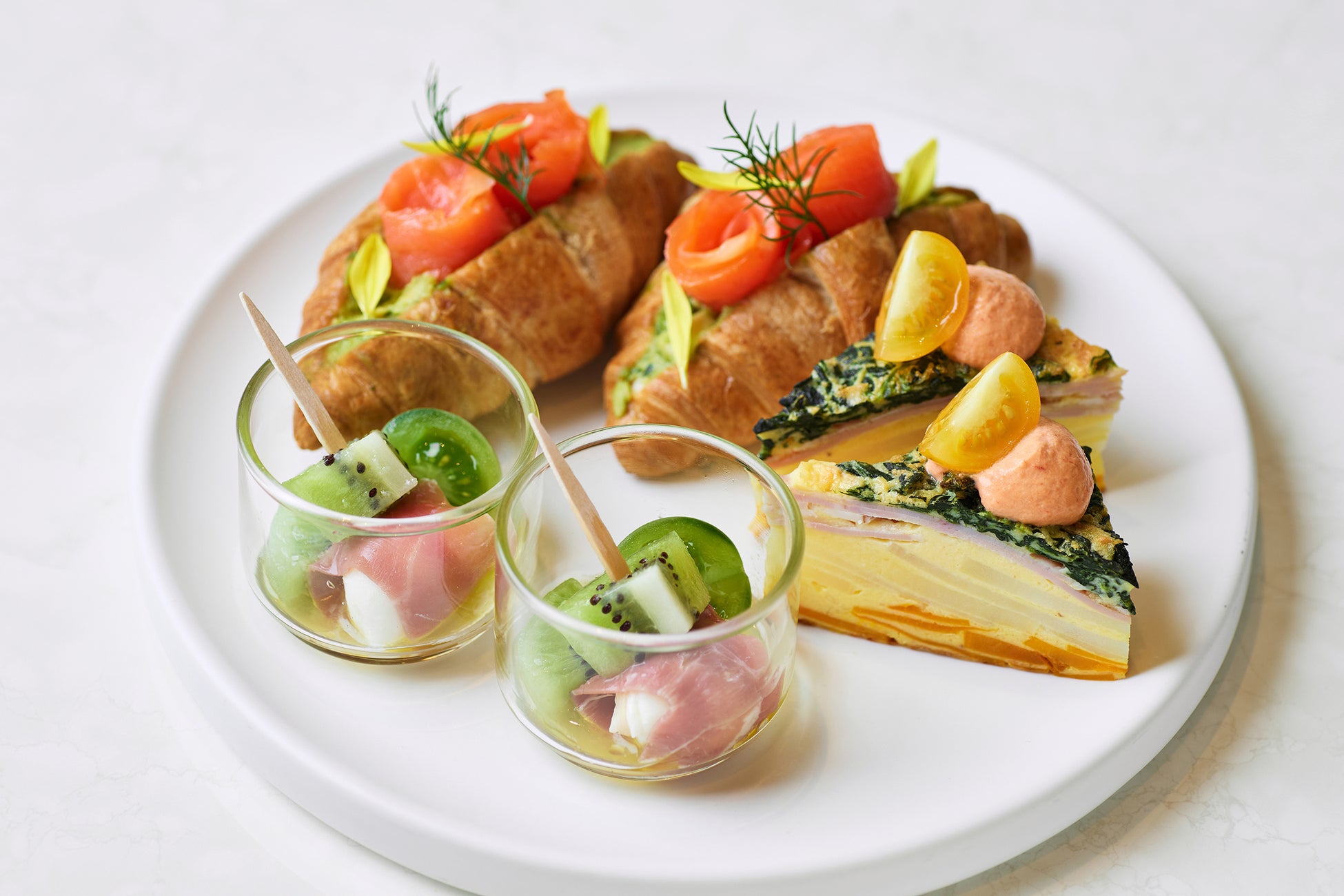 3段目:キッシュミルフィーユ トマトクリームのガトー仕立て、スモークサーモンとアボカドのクロワッサンサンド、生ハムとキウイ、モッツァレラのピンチョス