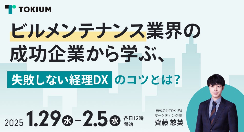 支出管理にまつわるクラウドサービスを提供する株式会社TOKIUM(本社:東京都中央区、代表取締役:黒﨑 賢一、以下「TOKIUM」)は、2025年1月29日から2月5日まで、ビルメンテナンス業界の企業を対象にしたオンラインセミナー、「ビルメンテナンス業界の成功企業から学ぶ、失敗しない経理DXのコツとは?」を開催いたします。