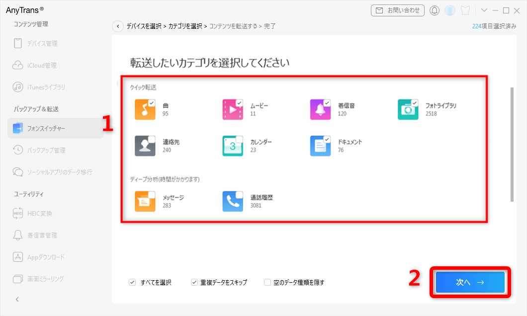 Step4.転送したいデータを選択して、また「次へ」をクリックします。転送が始まります。