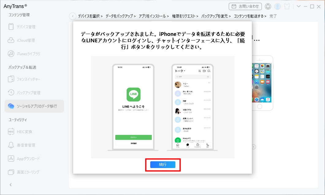 Step4.指示に従って、スマホでLINEのバックアップを作成します。そして「次へ」をクリックします。