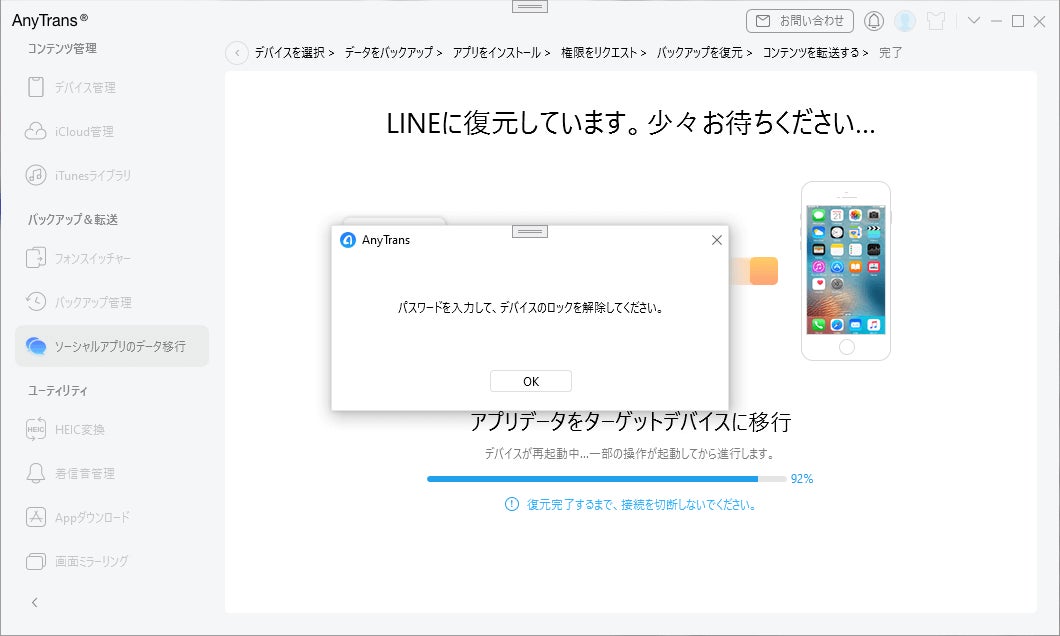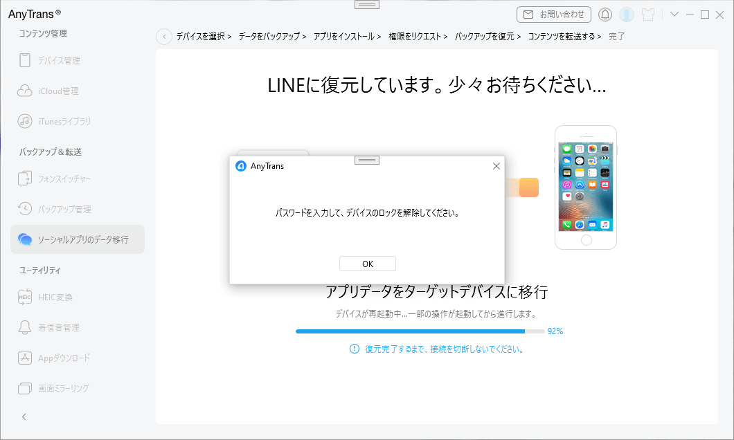 しばらくすると、LINEトーク履歴がiPhoneに移行されます。