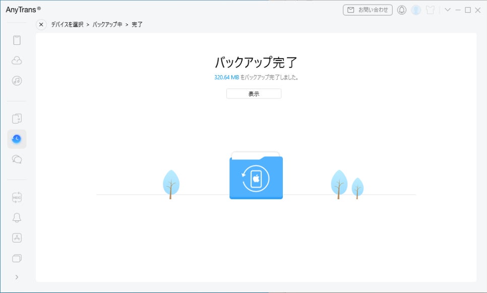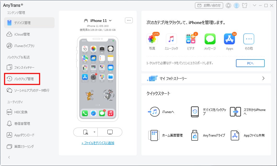 Step2.iOSデバイスが認識されたら、画面の左側である「バックアップ管理」を選択します。
