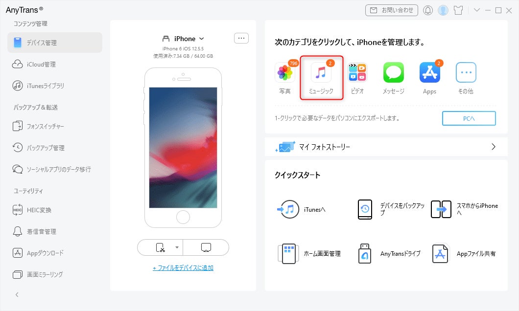 Step1.AnyTransをダウンロードして起動します。UBSケーブルでiPhoneをパソコンに接続します。