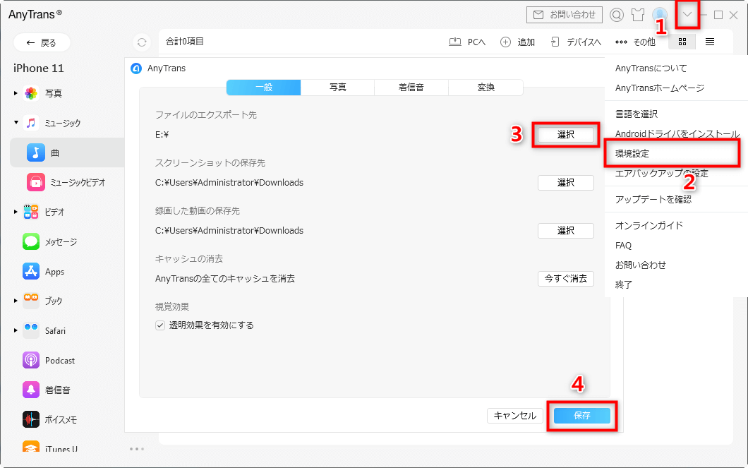 Step4.フォルダやUSBメモリなどの指定な場所に保存したいなら、右上のメニューアイコンをクリックして、「環境設定」をクリックします。そこでファイル保存先が設定できます。