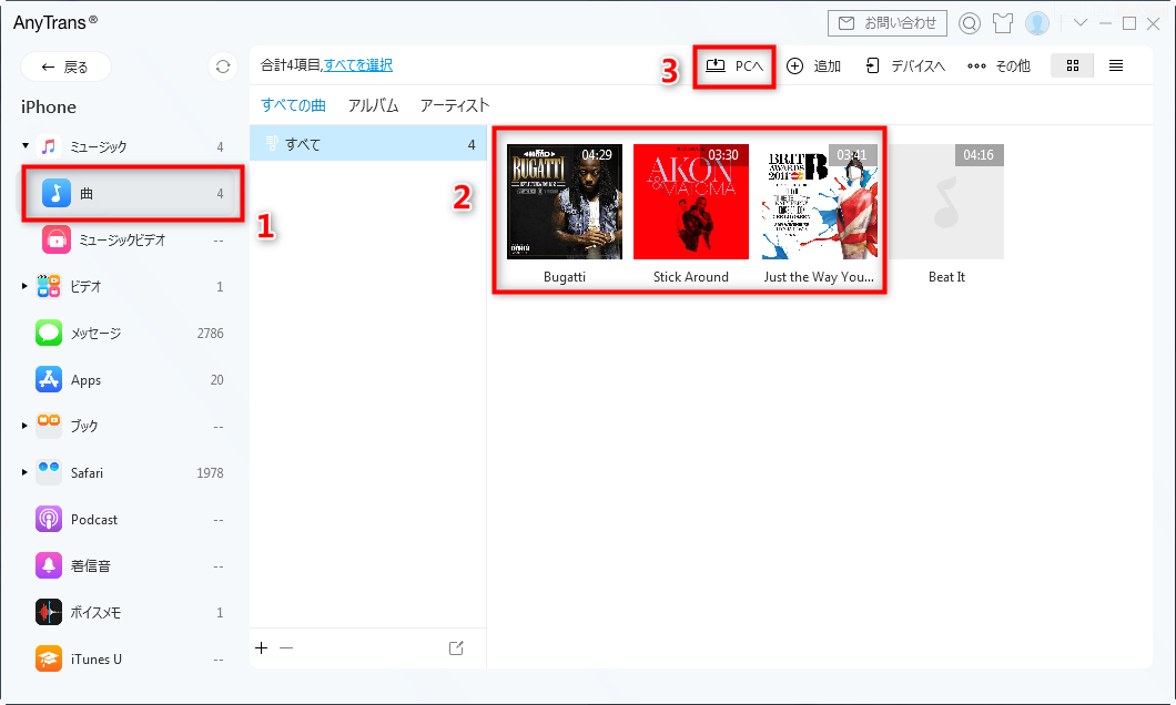 Step3.左側にある「曲」を選択して、転送したい音楽のファイルを選択して、「pcへ」のボタンをクリックします。