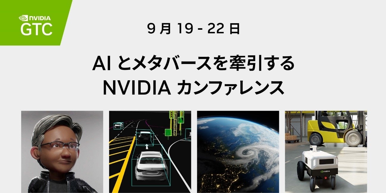 NVIDIA は、9 月 19 日から 22 日まで、GTC カンファレンス(https://www.nvidia.com/ja-jp/gtc/ )をバーチャルで開催いたします。NVIDIA の創業者/ CEO であるジェンスン フアン (Jensen Huang) が基調講演で多数のニュースを発表するほか、世界的なビジネス リーダーやテクノロジ リーダーによる 200 以上のセッションを予定しています。