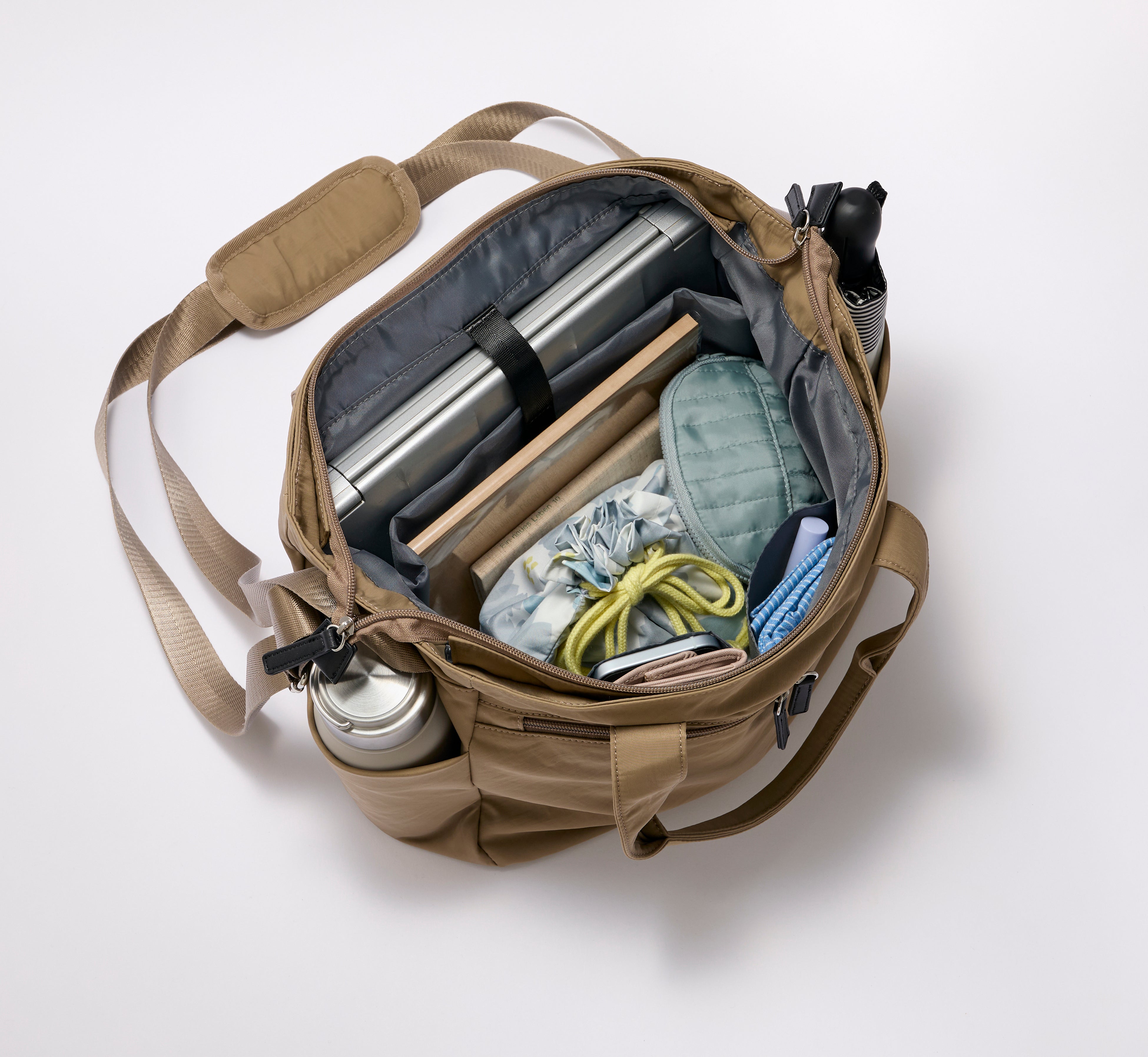 「旅先での整理整頓もラク!荷造り上手な3WAYボストンバッグ」は、日帰りはもちろん一泊二日程度の旅行に使えるバッグで、「荷造り」に特化した工夫を各所にちりばめています。一番のポイントは、180度全開するファスナーでスーツケースを広げた時のように中身を一気に見渡すことができる点です。更に、中は左右全面ポケット仕様で整理がしやすく、荷物が見やすいグレーの生地を使用しています。
