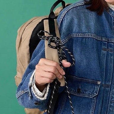 リュックのショルダーベルトの肩上部分にスライドできるカラビナを付けました。手持ちの荷物をそのカラビナに引っ掛けると、リュックが“他の荷物まで持ってくれる”状態となり、両手が空くので何かと便利です。