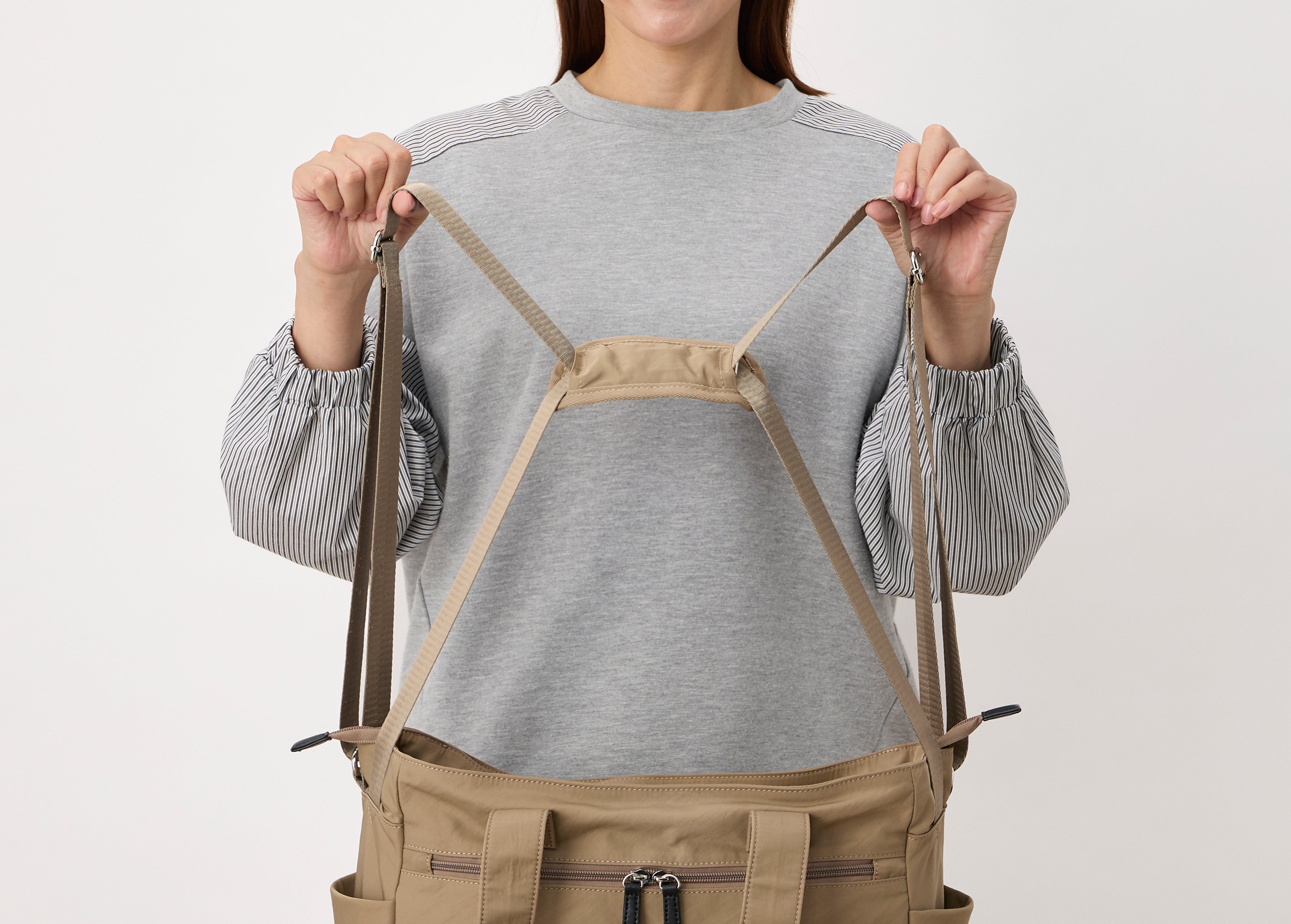 例えば、レジャー中や小さなお子さまがいて荷物を頻繁に出し入れしたい時、あるいは電車利用時や旅行中で荷物は前抱えが安心な時など、あらゆる場面で活躍します。様々なシーンやファッションにフィットするシンプルで機能的なデザインに仕上げました。