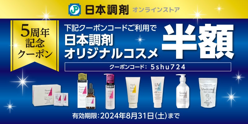日頃のご愛顧に感謝をいたしまして、5周年記念キャンペーンを開催中です。本キャンペーンでは、日本調剤オリジナルコスメを表示価格の50%OFFでご購入いただけます。