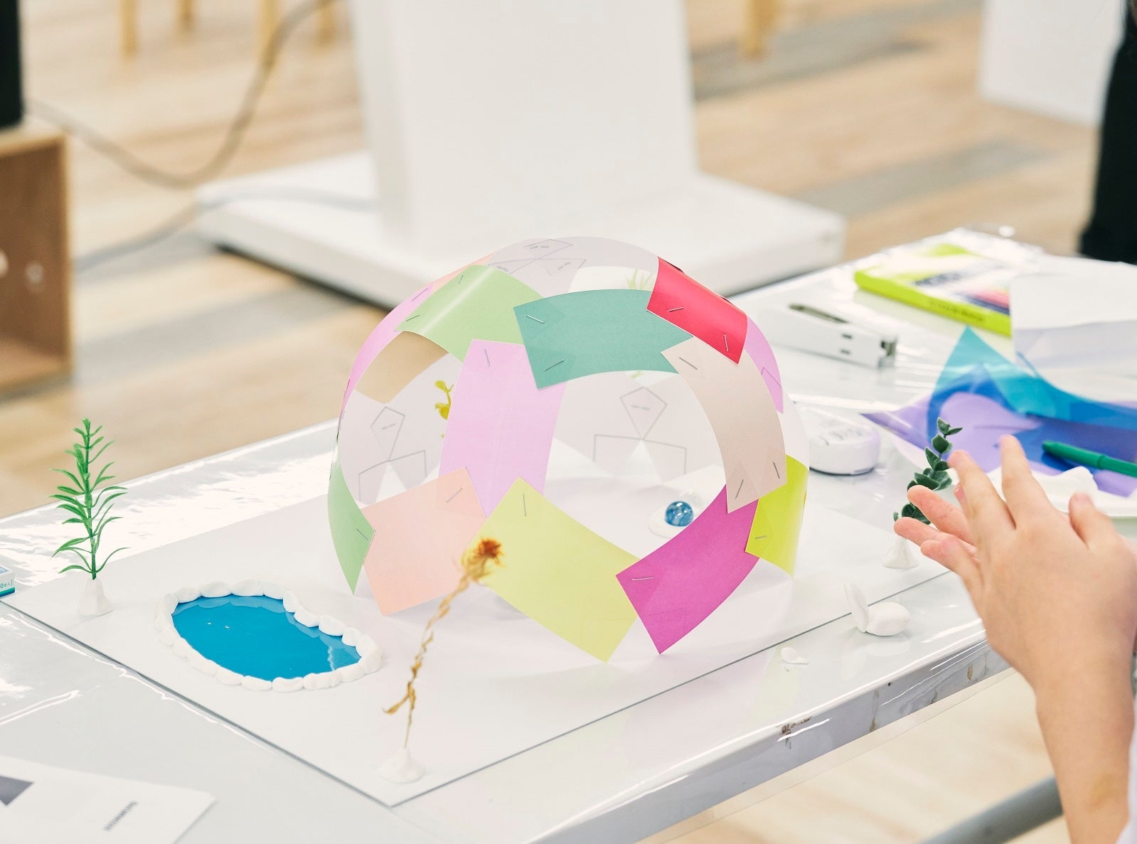 来館者が模型作りを体験できるエリアを設置します。映像を見ながら、積み木を使ったお家作りや、色紙を使用したドーム作りを常時体験いただけます。
