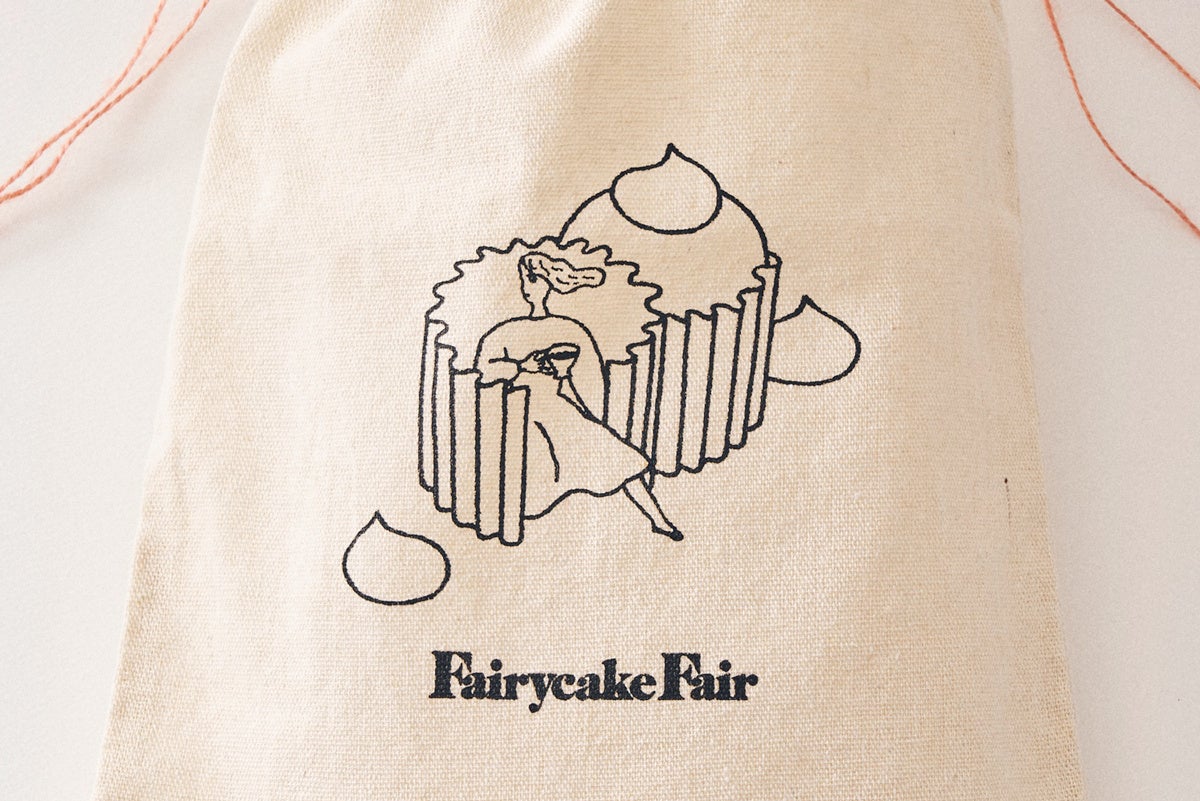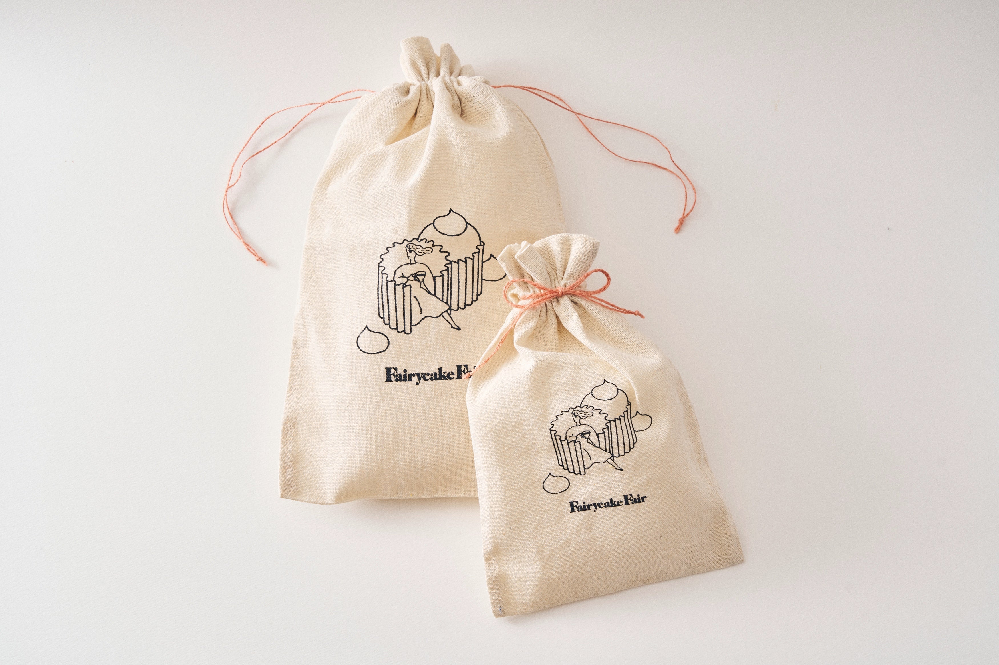フェアリーケーキフェアを象徴するカップケーキのデザインを施したラッピングバッグができました。風合いの良いナチュラルな手触り、贈る喜びとその瞬間のあたたかさを感じられる前田ひさえさんのうっとり可愛いイラストが、大切なギフトにワクワク感を演出します。