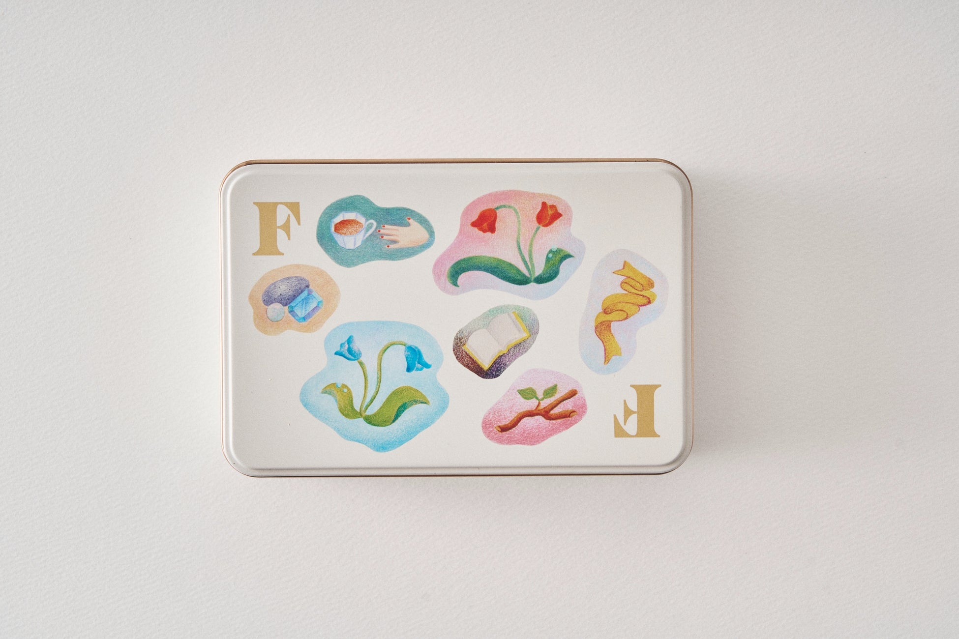 家族みんなで食べて楽しむひとときをイメージして作ったビスケット缶です。パッケージデザインは、前田ひさえさんが『子どもの頃の大切な宝物の記憶』をテーマに手がけました。朝露がついた葉っぱ、拾ったきれいな石や小枝、イミテーションの宝石、大人の飲む紅茶に憧れた気持ち、昨日読んだ物語のかけら…。大人も子どもも心に残る大切な記憶をしまっておけるような缶をイメージしています。
