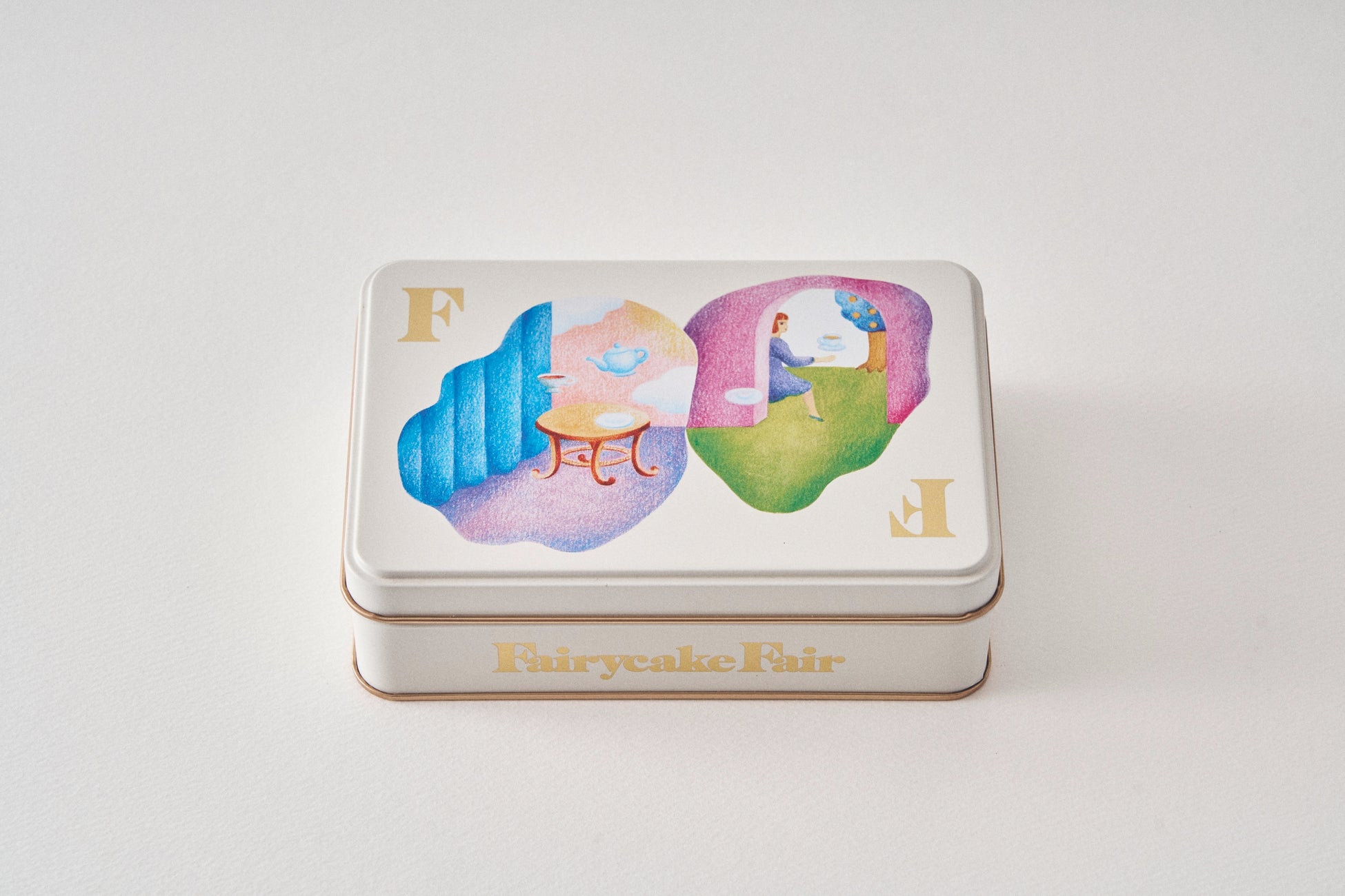 ビスケットを囲み、さまざまな人々が豊かな時間を過ごせるひとときをイメージして作ったビスケット缶です。前田ひさえさんがちょっぴり神秘的なお茶の時間をテーマに<記憶>や<時間>を表現。たのしいティータイムのおしゃべりが時空を越え、そのひとときが宝物に感じられる、そんな誰もが心に残している児童文学のように、静かにそっと語りかけるような優美で幻想的なデザインです。