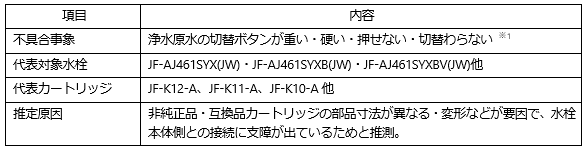 一部の非純正品・互換品を使用した際の、浄水栓の不具合が報告されています。(※2)