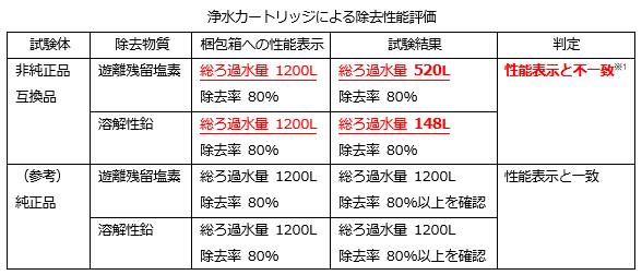 その結果、LIXIL純正浄水カートリッジが梱包箱に表示された通りの性能 の発揮を確認できた一方で、非純正品・互換品浄水カートリッジは、梱包箱に記載された性能を満たしていないため、家庭用品品質表示法に反しているという結果となりました。