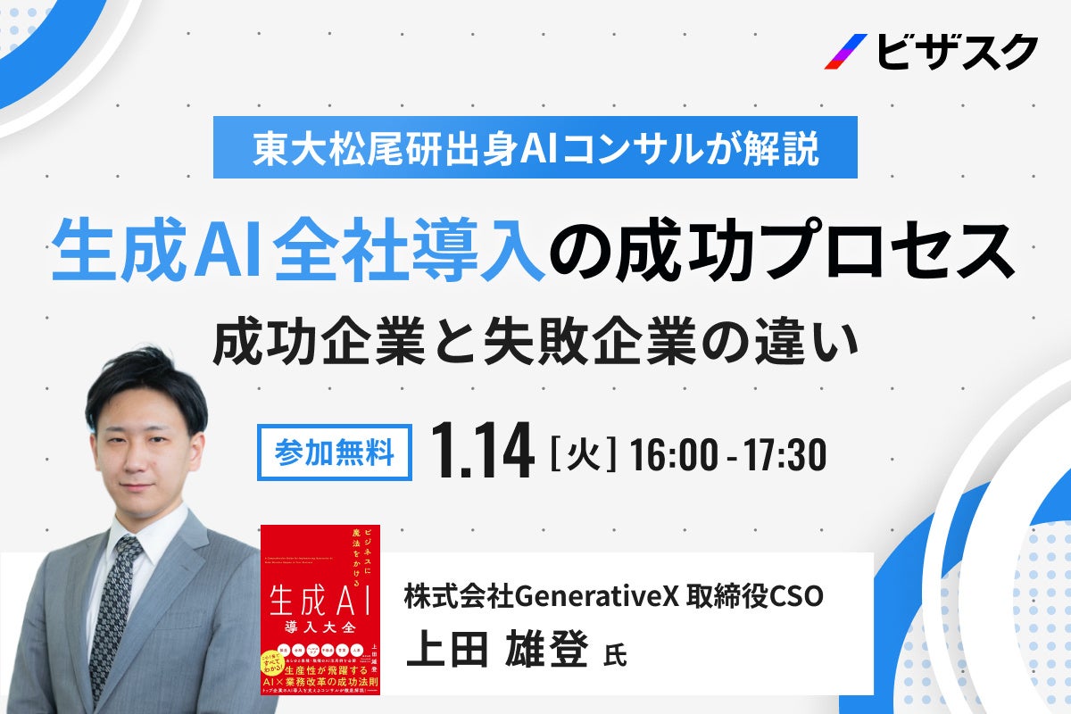 株式会社ビザスク(以下、当社)は、「生成AI全社導入の成功プロセス」をテーマに、株式会社GenerativeX 取締役CSO 上田 雄登氏 ご登壇による無料オンラインセミナーを 1/14 (火) 16時より開催します。