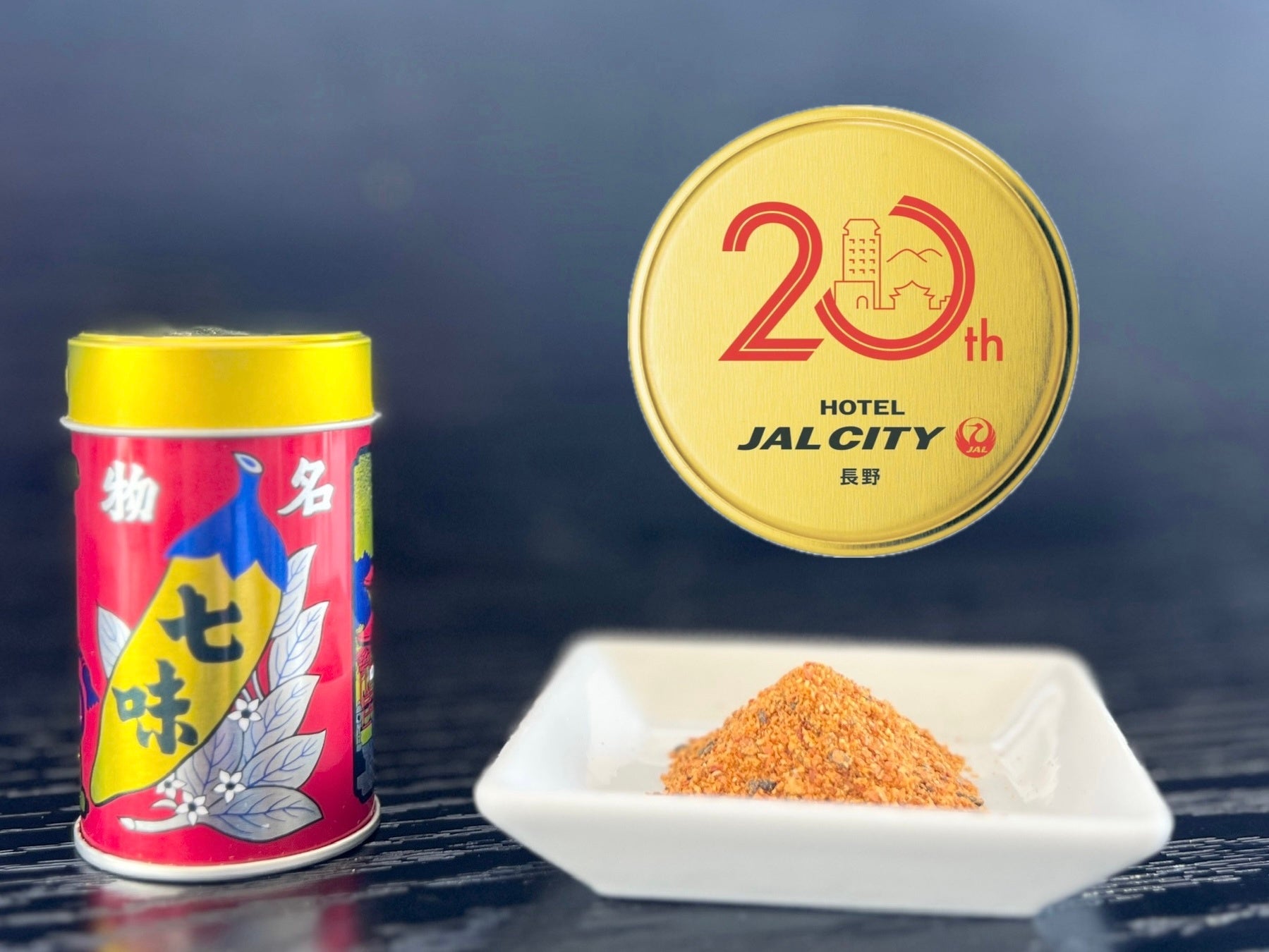 第一弾では、長野市の景色を一望できる高層階に位置する「Jフロアー」および、2024年4月のリニューアルでモダンかつ機能的な客室に生まれ変わった「ニュースタンダードフロア」限定の宿泊プランをご用意しました。江戸時代から善光寺門前の名物として親しまれている『根元 八幡屋礒五郎』の七味唐からし缶をセットにした宿泊プランで、開業20周年記念ロゴマークをあしらったオリジナルデザインの七味缶をご用意します。ご宿泊の記念やお土産としてお持ち帰りいただけます。
