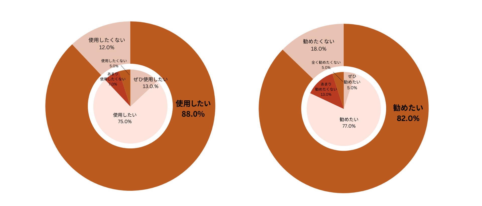 保育士・幼稚園教諭100名に対するアンケート調査を実施した結果、保育士・幼稚園教諭の82%が子育て中のママ・パパに「ぜひ勧めたい」「勧めたい」と回答し、88%が自分自身でも「ぜひ使用したい」「使用したい」と回答しました。