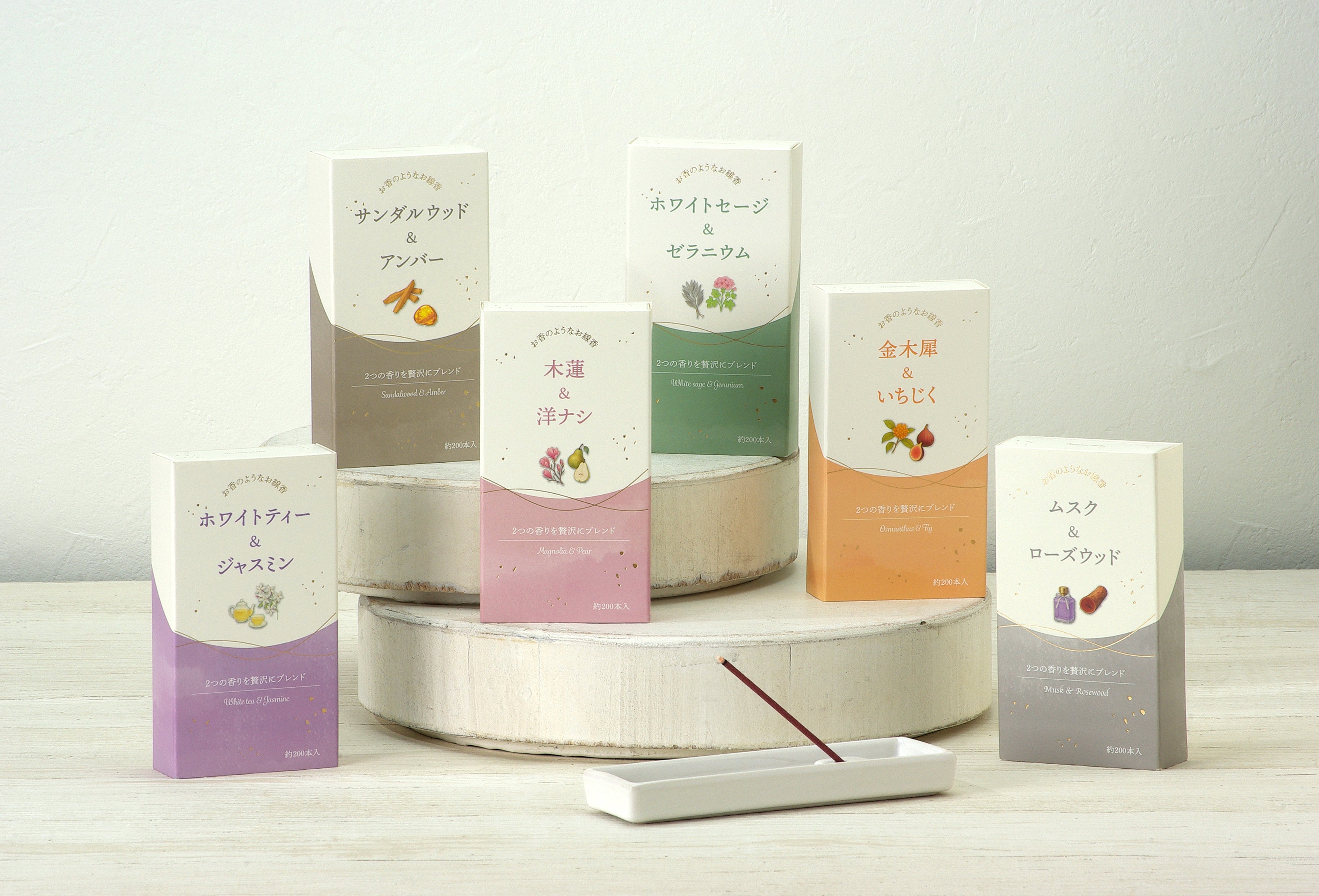 お香のようなお線香シリーズは、パッケージをより分かりやすくするためにデザインをリニューアルしました。どんな香りなのかを想起させる香りのイラストを正面に配置。香り名も大きく表記しました。