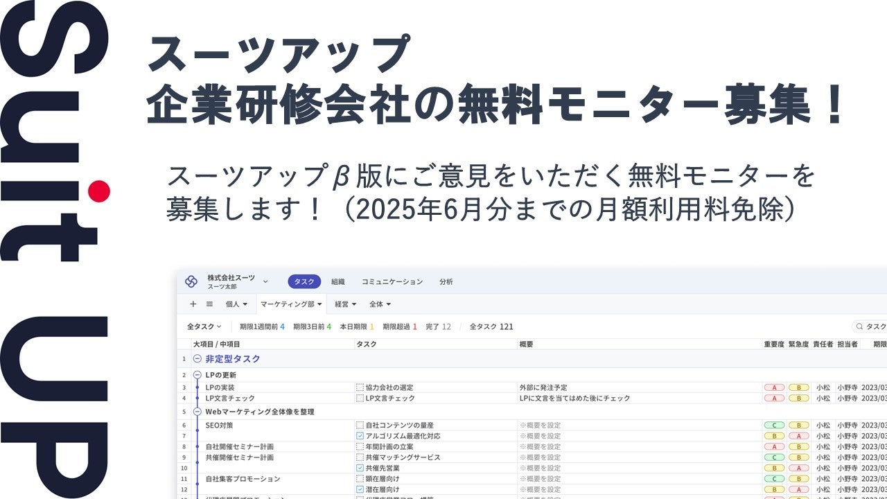 株式会社スーツ(所在地:東京都千代田区、代表取締役社長CEO:小松 裕介)は、チームでかんたん、チームのタスク管理・プロジェクト管理ツール「スーツアップ」において、企業研修会社の無料モニターを募集いたします。