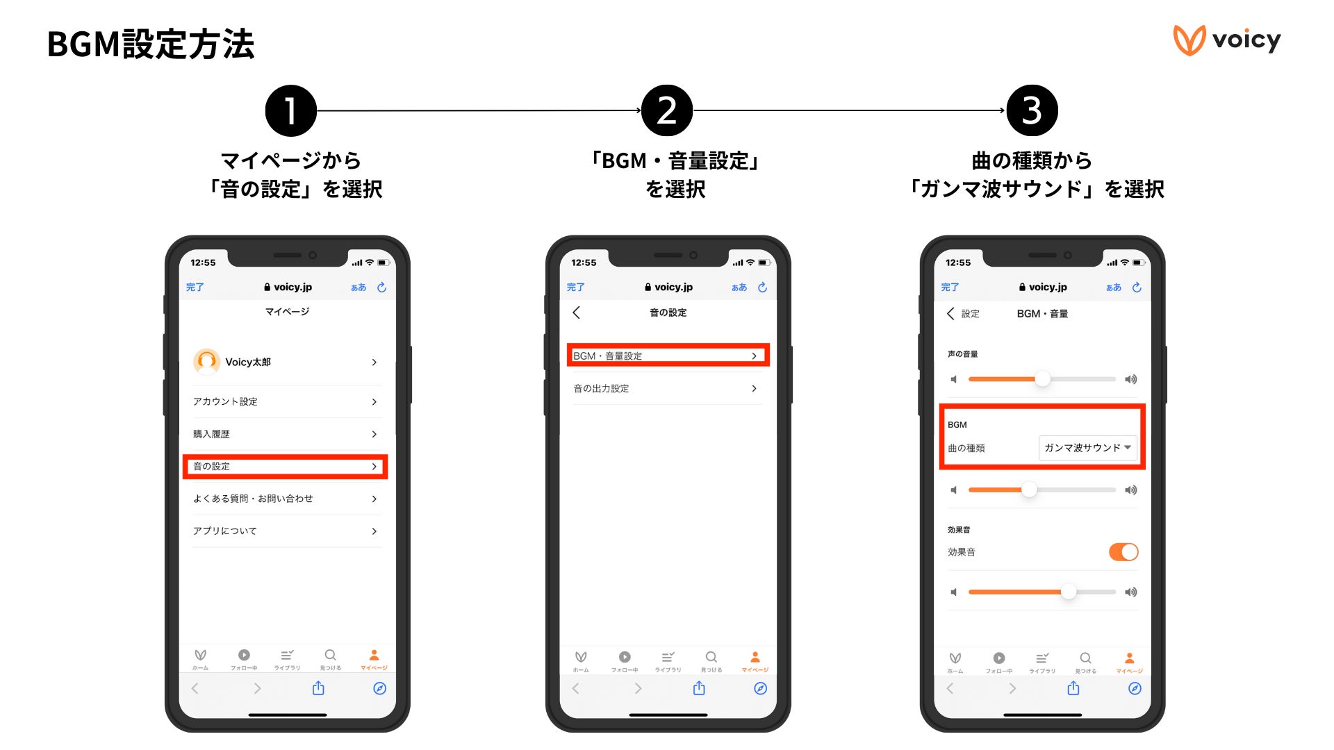 Voicyでは、パーソナリティ自身がBGMを用意する必要がなく、リスナーが自分自身で曲目の中から好きなBGMを選び、放送の背景に流すことが可能です。倍速機能を使っても、話声だけが速度調整されるためストレスなく聴くことができます。これまで、BGMの種類は「コーヒータイム」「イノセントバード」「エレクトロ」の3種類でしたが、今回、新たに「ガンマ波サウンド」を選択できるようになりました。ガンマ波サウンドは、テレビやラジオなどの音をリアルタイムに40Hz周期の音 ※2に変調することができる特殊な技術を用いた、生活をしながら認知機能をケアできる可能性がある音のことです。※3 今回選択できるようになったBGMは、ガンマ波サウンドを活用した楽曲です。