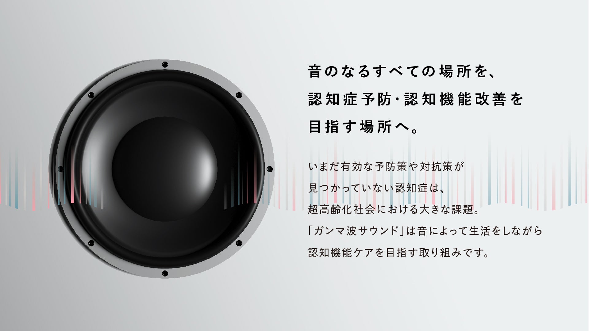 「ガンマ波サウンド」は、テレビやラジオなど、日常のあらゆる音をリアルタイムに変調することで、生活をしながら認知機能をケアできる可能性がある音です。40Hzの周波数は、ヒトが記憶や推論などの問題解決型の思考をしているときに現れる脳波「ガンマ波」と同じ帯域であり、アルツハイマー型認知症の方では健常人と比較してガンマ波が減少していることなどが報告されています※1。また、40Hz周期の音の呈示によって、マウスの認知機能が改善した研究結果や、ヒトを対象とした臨床試験においても40 Hz周期の音と光を用いて認知機能悪化の抑制や脳萎縮の抑制を示唆する研究結果が得られており、40Hz周期音は世界的に注目を集めています※2。