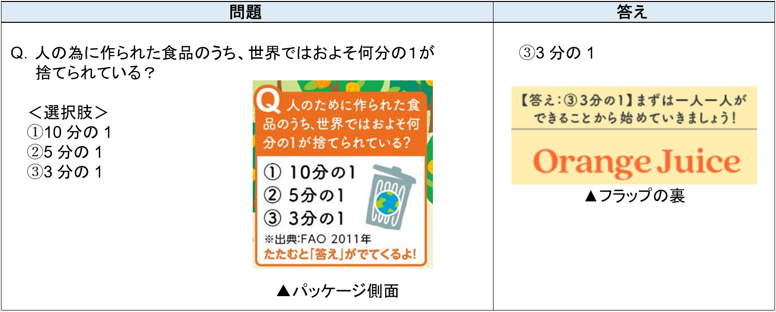 昨今の環境問題や食育への意識の高まりを受け、本商品はパッケージの側面に環境や食育に関するクイズを記載しています。3つの選択肢の中から正解を選び、パッケージのフラップ裏に記載されている回答を確認し、楽しみながら環境や食育を学ぶことが可能です。