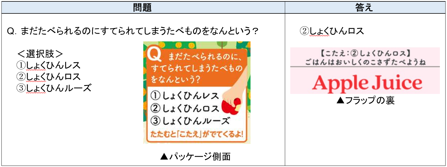 本商品は、上記のカゴメの取組みから得た知見を活かし、パッケージの側面に記載した環境や食育に関するクイズの問題文の中に、「たたむと『こたえ』がでてくるよ!」というメッセージを記載しました。クイズの答えを見るためには飲み終わった紙パックをたたむ必要があるため、親子で一緒にクイズを楽しみながら、自然に「たたんで捨てる」習慣をつけられることを期待しています。