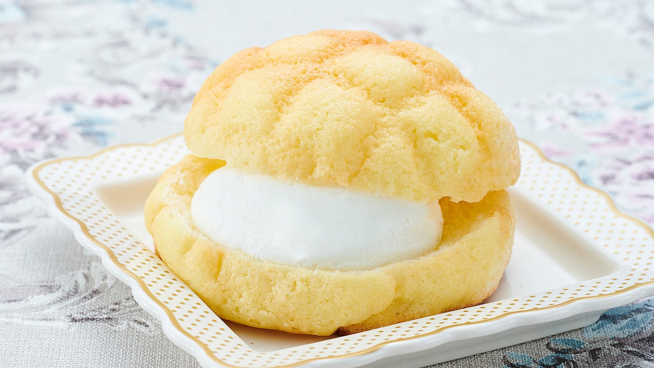 メロンパンをカットして、間にソフトクリーム味のホイップをサンドしました。つめたく冷やしてお召し上がりください。