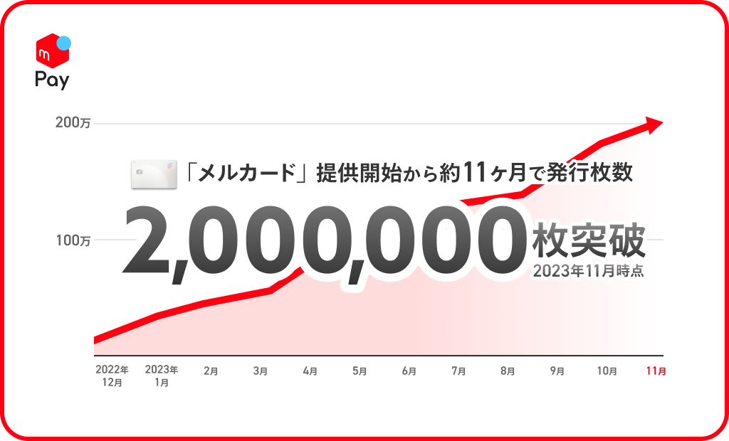 「メルカード」は、すべてのお客さまが申込可能となってから(2022年12月1日)、1年足らず(約11ヶ月)でカード発行枚数200万枚を突破しました。(※2)お客さまからは還元率の高さだけでなく、利用履歴の確認や利用上限金額の設定のしやすさ、支払いの柔軟性といった機能面でもご好評いただいています。