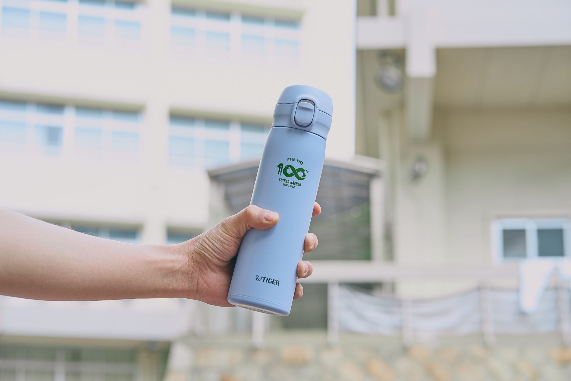 今回タイガー魔法瓶が、神港学園高等学校の卒業生に贈呈したボトルには、神港学園高等学校が創立100周年記念を迎えることにちなんで、100周年のロゴデザインを施しています。スクールカラーの深緑を使った卒業生と先生のお揃いのボトルです。
