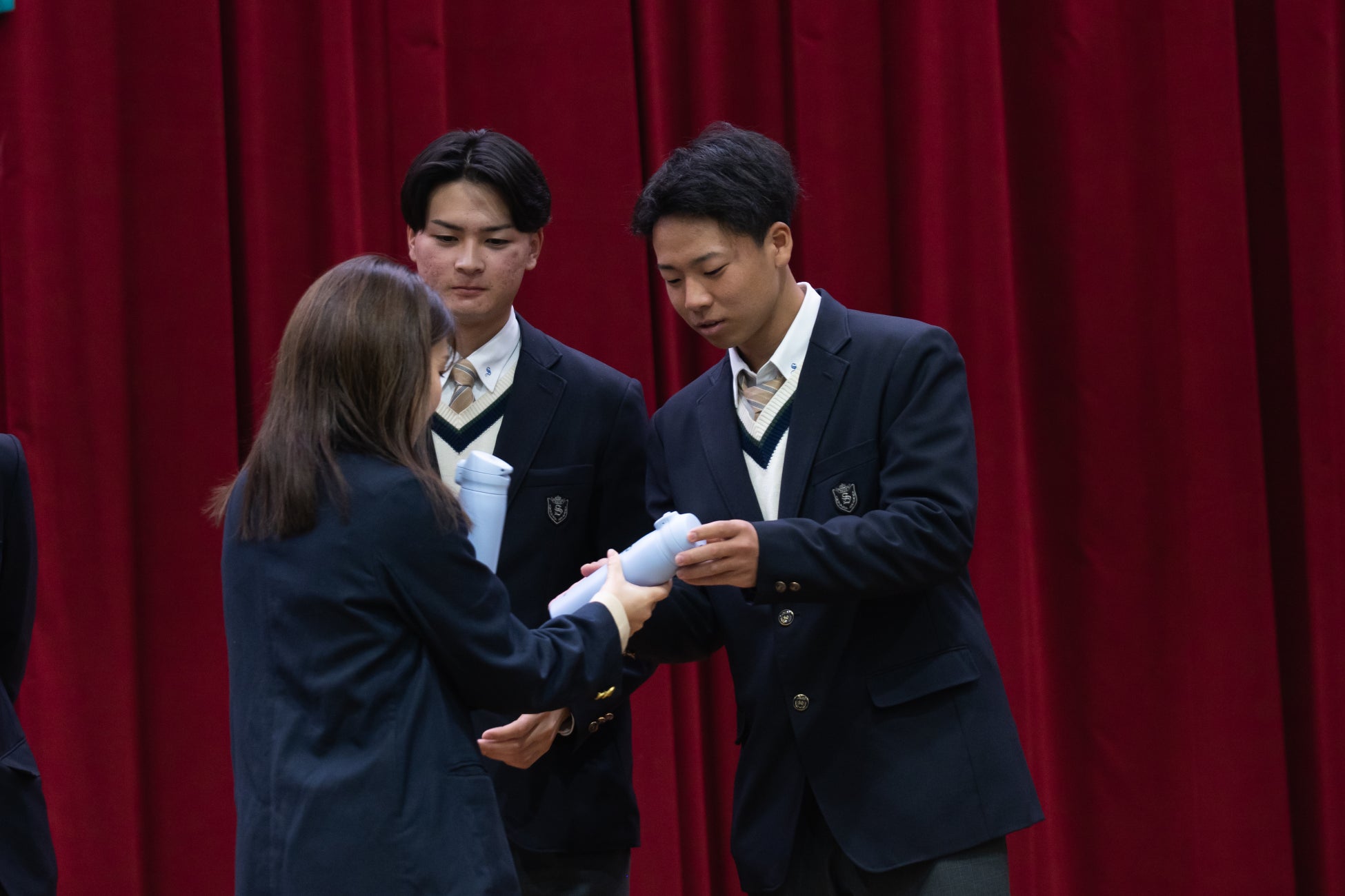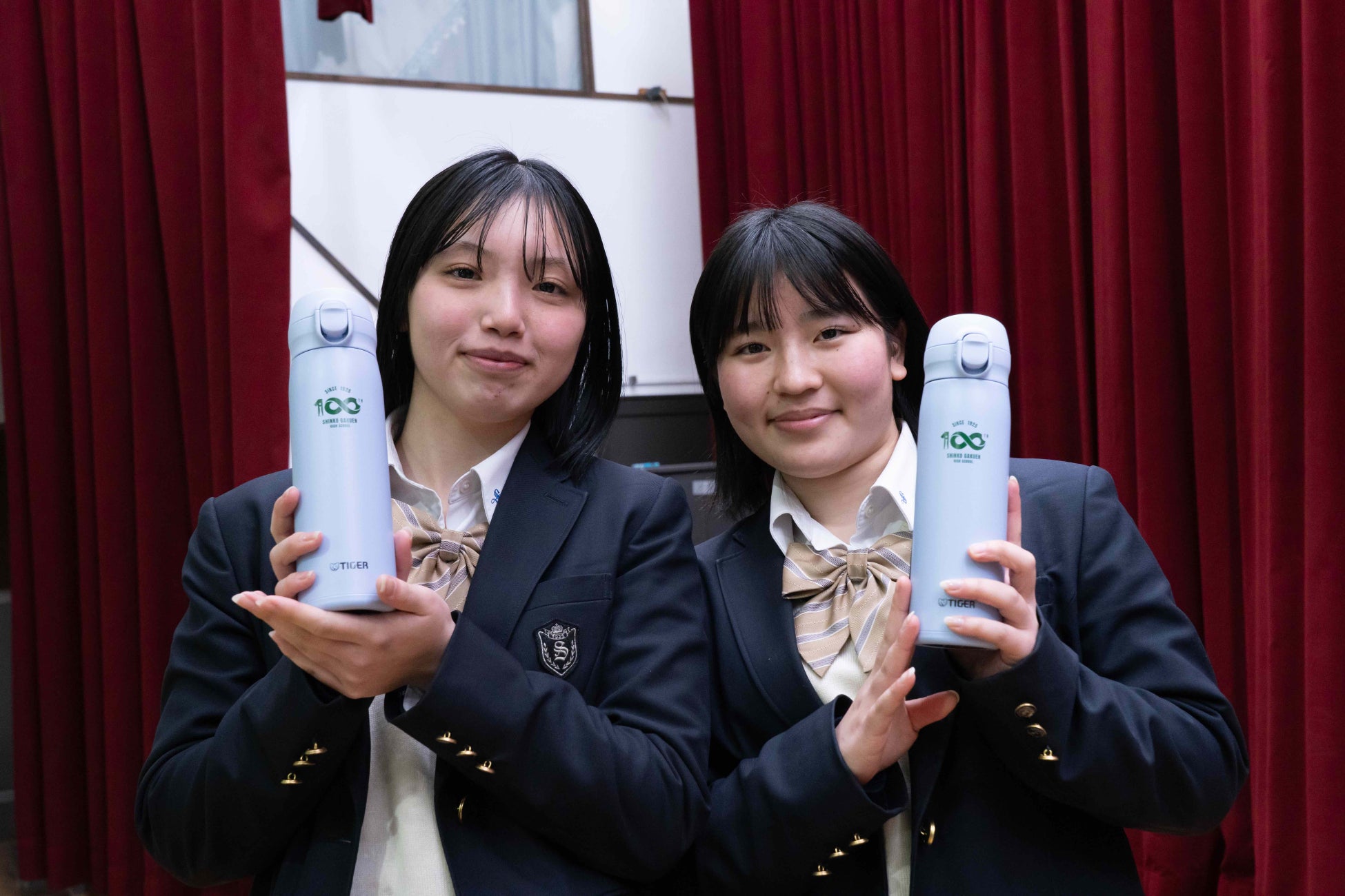 その後、タイガー魔法瓶の広報担当者から卒業生代表の生徒に、神港学園100周年記念オリジナルデザインボトルを贈呈。贈呈された卒業生代表の生徒からは「このような素敵なプレゼントをありがとうございます。僕たちの過ごした3年間の思い出が冷めないよう、卒業後の次のステージでも大切に使います。高校最後に素敵な思い出をありがとうございます!」とコメントいただきました。