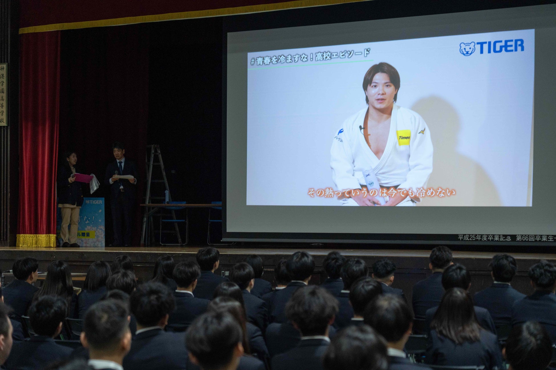 当日は、「#青春を冷ますな!魔法瓶キャンペーン」の一環で、先生方とタイガー魔法瓶から、生徒たちへオリジナルデザインのボトルを人数分プレゼント。最後には神港学園高等学校の卒業生であり、世界で活躍する柔道選手・阿部一二三さん(パーク24)からの卒業生に向けた「ビデオレター」をサプライズで上映しました。