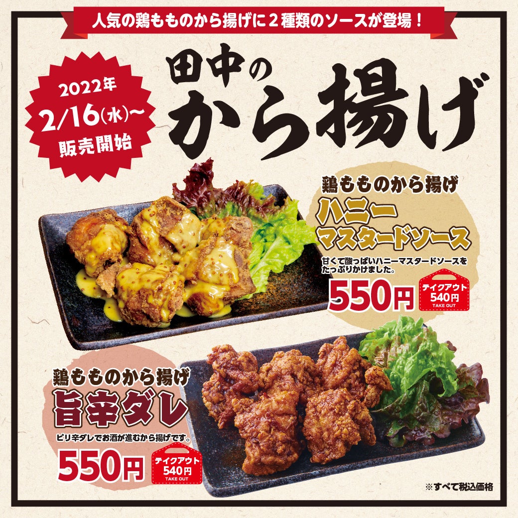 株式会社串カツ田中ホールディングス(本社:東京都品川区東五反田、代表取締役社長:貫 啓二、以下:串カツ田中)は2022年2月16日(水)より新メニュー 鶏もものから揚げ「ハニーマスタードソース」と「旨辛ダレ」の販売を開始いたします。