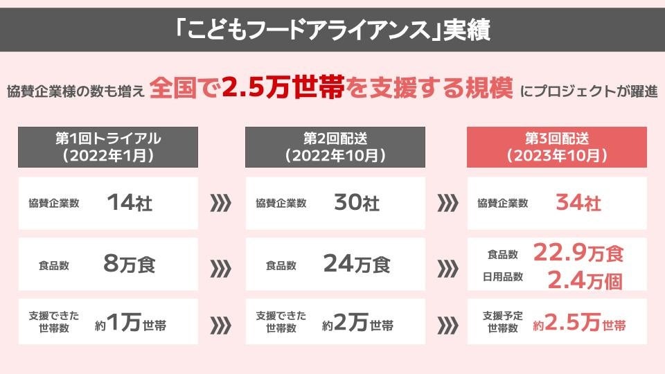 物価高騰の影響もあり、生活困窮者への支援の高まりを背景に「こどもフードアライアンス」の主旨に共感いただく企業が増加し、協賛企業が34社に増加しました。また、支援予定の世帯数も前回から1.25倍となる約2.5万世帯へ拡大することができました。