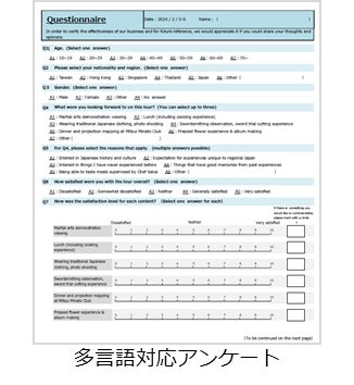 ①コンテンツの磨き上げに活用するアンケートを多言語で作成。モニターツアーに招聘された海外の旅行関係者に対してアンケート調査を実施し、データ分析を行いました。
