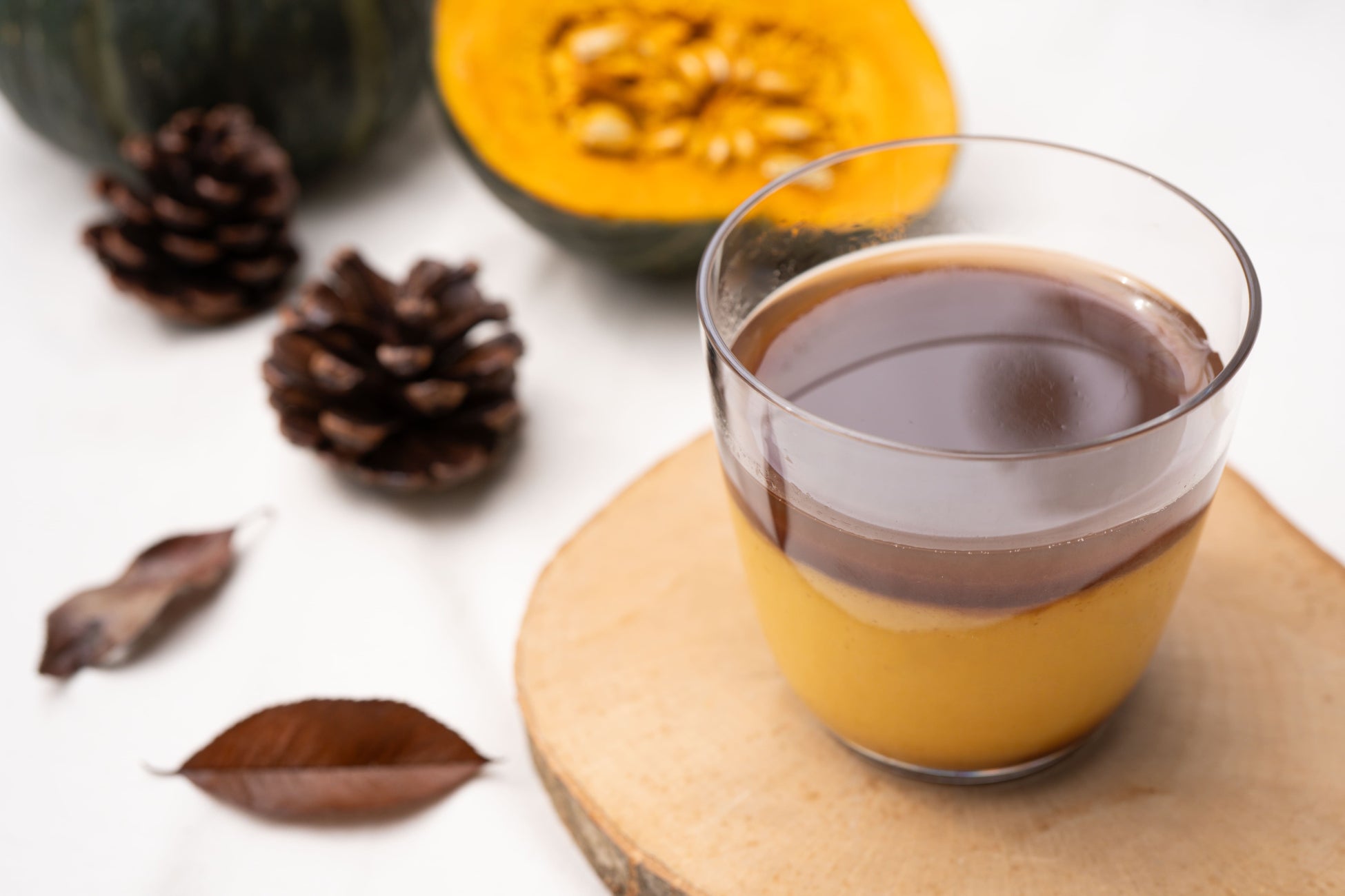 くず餅の原料である発酵小麦澱粉を使用したプリンの生地に、かぼちゃを加えました。かぼちゃの甘さを引き立たせるためにプリン自体の甘さを控えめに仕上げ、濃厚な味わいに。