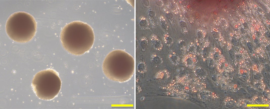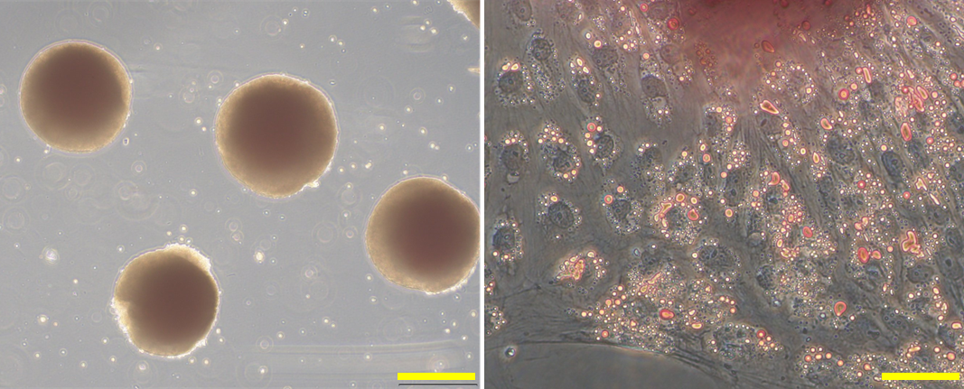 専用プレートを用いた培養法では、辺縁整の細胞凝集体(スフィア) ※4が得られました(図1, 写真左)。このスフィアについて、脂肪滴を特異的に染色したところ、細胞の核周囲にはBA特異的な多数の小さな脂肪滴が観察されました(図1, 写真右)。