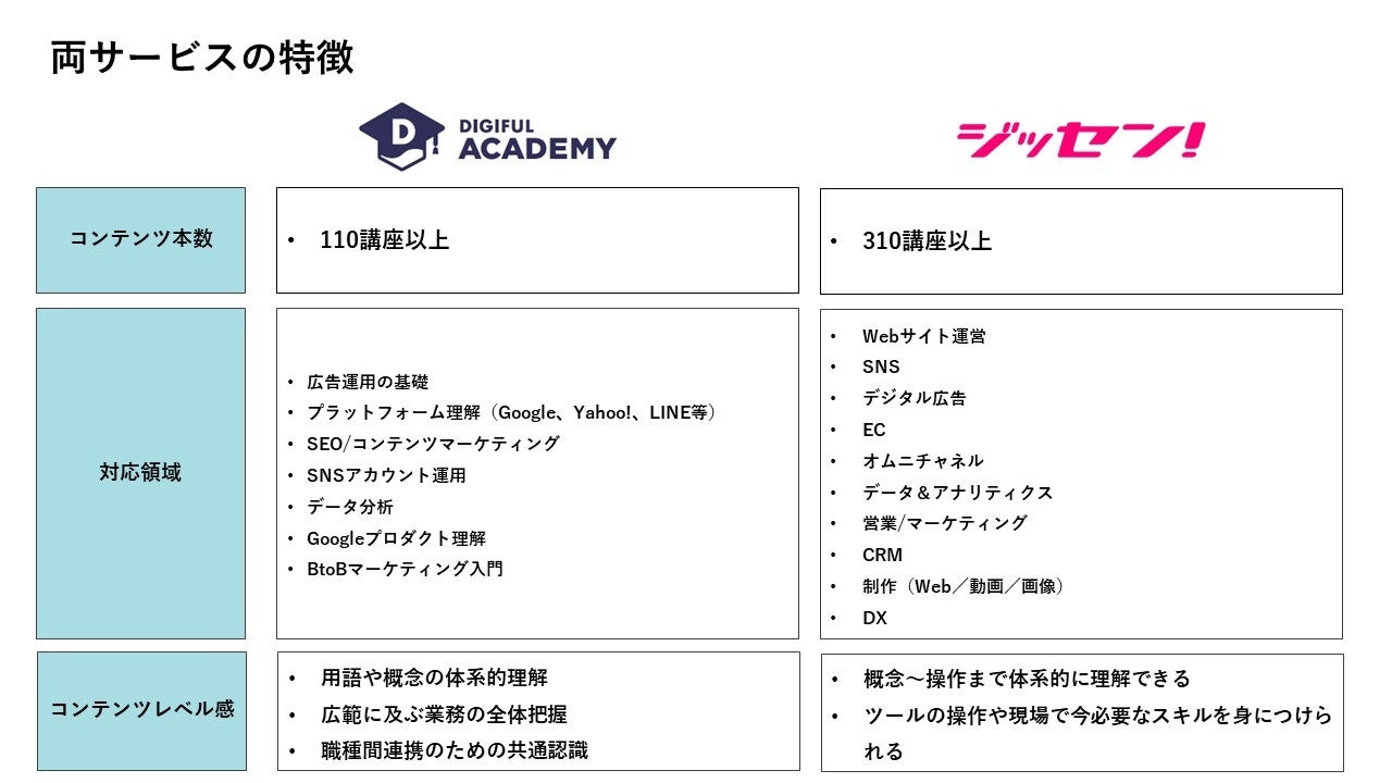 このような課題に対し、アイレップはマーケティング担当者のためのオンライン学習サービス「DIGIFULアカデミー」を、SOTはDX・マーケティング専門eラーニングサービス「ジッセン! オンライン」をそれぞれ提供し、デジタルマーケター育成のためのコンテンツ制作を行ってまいりました。