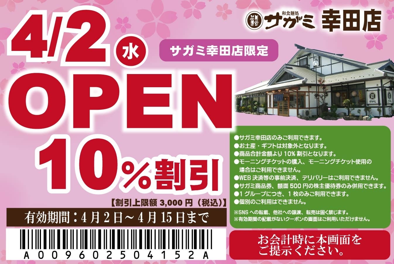 また、サガミ幸田店限定でご利用いただける割引券を記載いたしました。この画面を掲示で期間中、何度でもご利用いただけます。