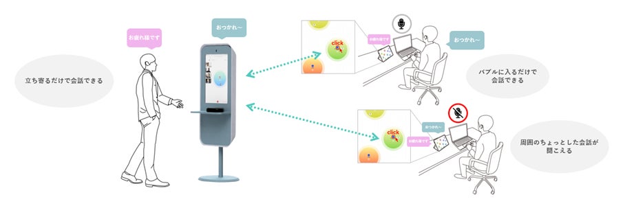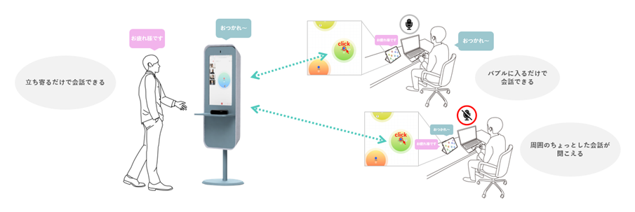 オフィス側はスタンドの前に立ち寄るだけ、リモート側はバーチャルオフィス上のルームに入るだけでオフィス×リモートで会話を始めることができます。web会議の設定などの煩わしい手順が不要で、離れたワーカー同士でも立ち話程度のラフな会話を手軽に行えます。