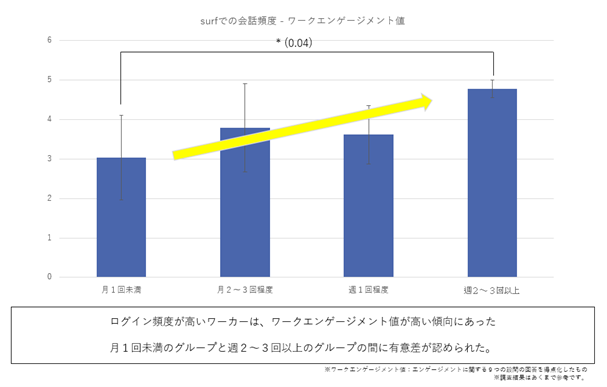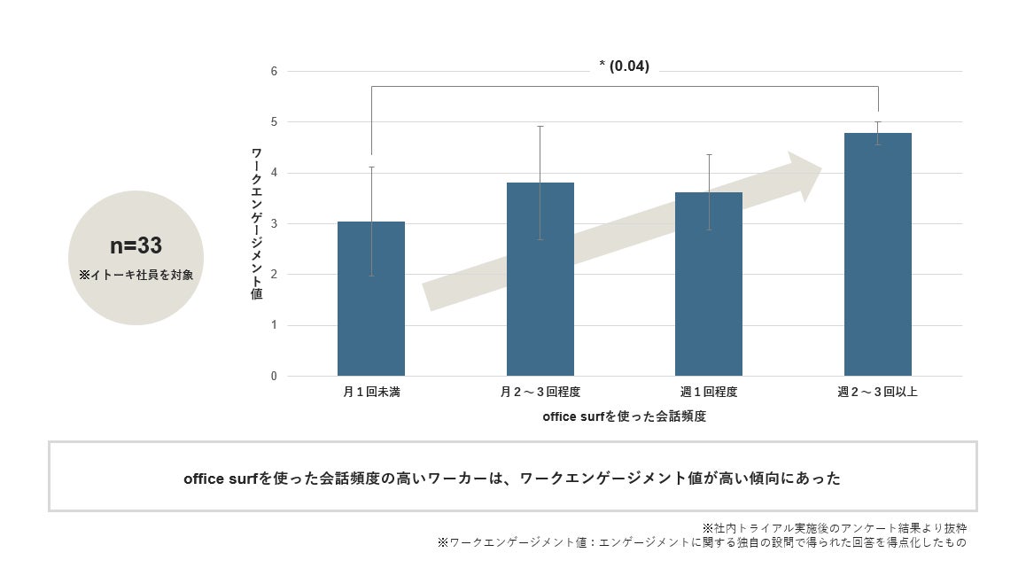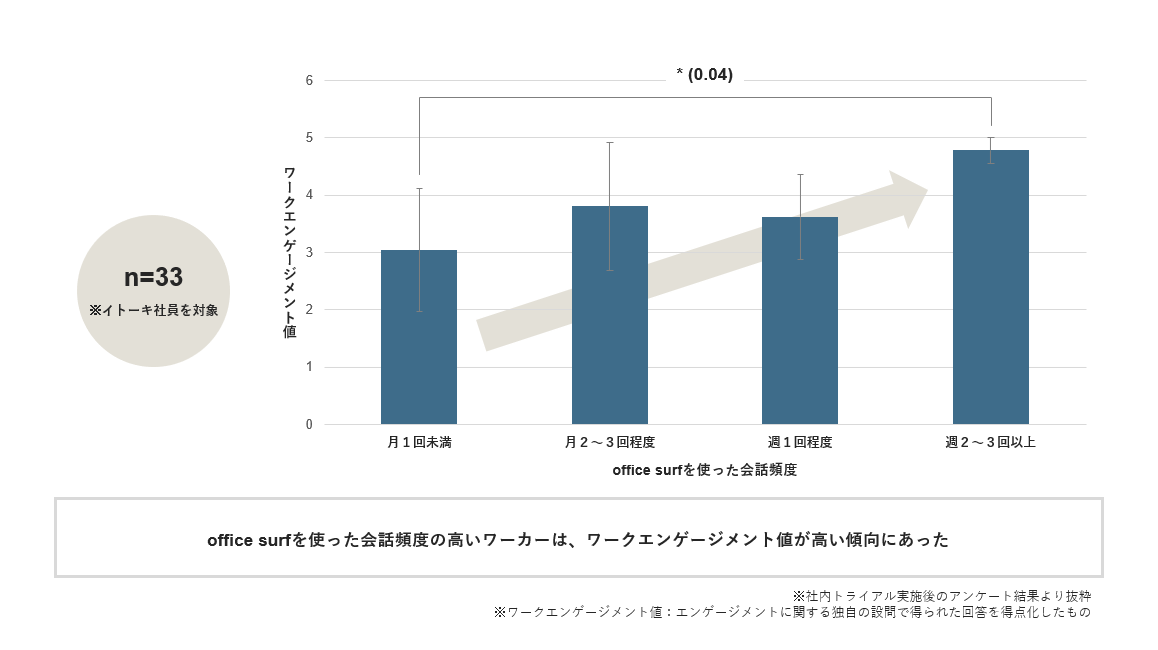 社内トライアルの結果、office surfを通して会話する頻度の高いワーカーほどワークエンゲージメント値が高い傾向にあり、ハイブリッドコミュニケーションが社員の帰属意識に有効に機能することがわかりました。