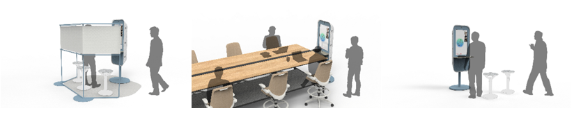 チャットスタンド単体だけではなく、オプションのフレームパネル、フロアシートとの組み合わせによりブリーフィングなどで使える空間を作ることができます。また、デスクとの組み合わせでチームコワーク空間を作るなど、他ラインナップとの組み合わせにより多様なコミュニケーションシーンでお使いいただけます。