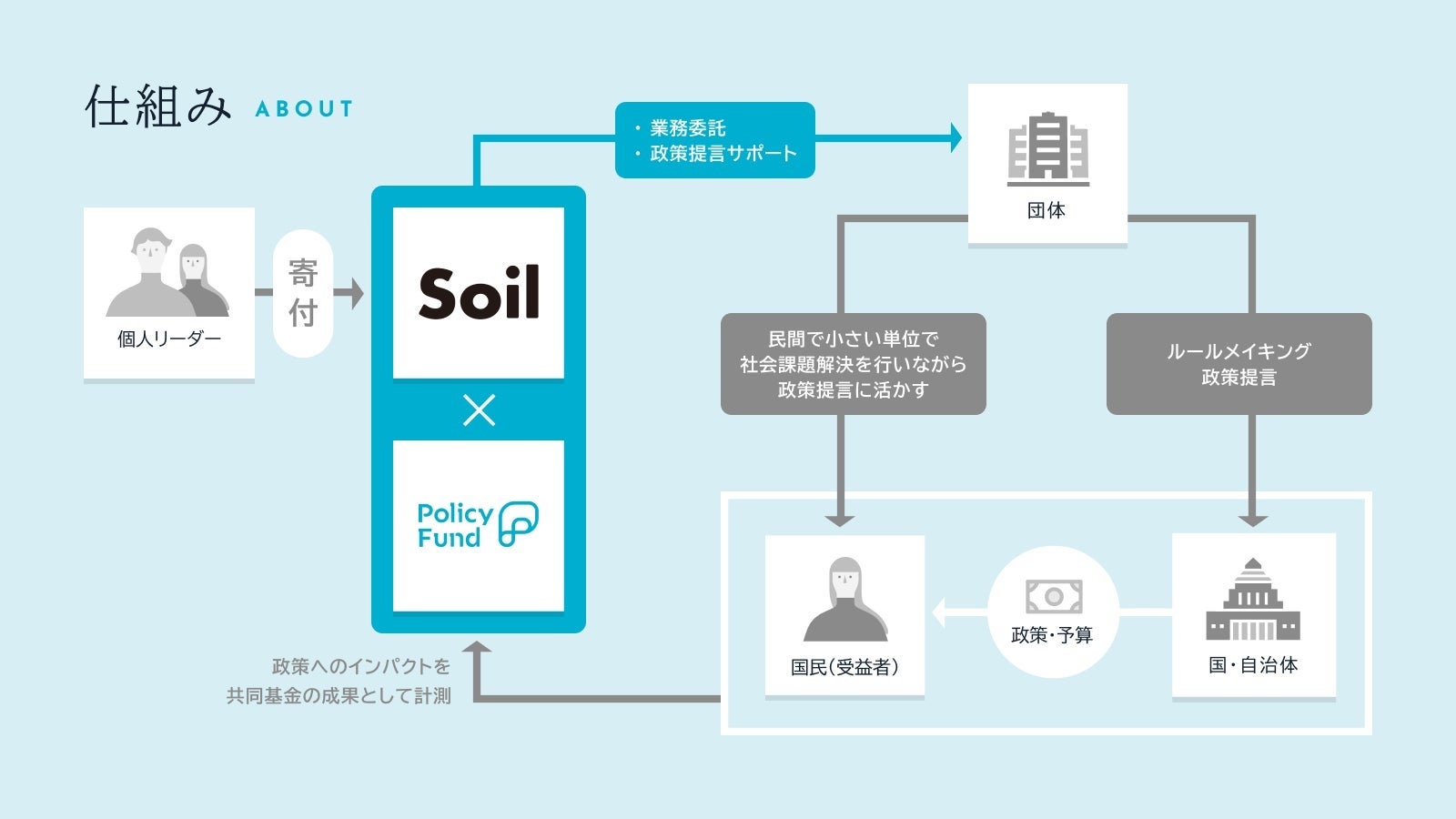 各領域の社会課題解決に専門性を持つ団体を募集し、Soilより政策提言のための調査・検証、資料作成等の業務委託を行います。 また、PoliPoliが政策提言のための伴走支援をいたします(委託金額は一団体あたり500万円を上限とします)。