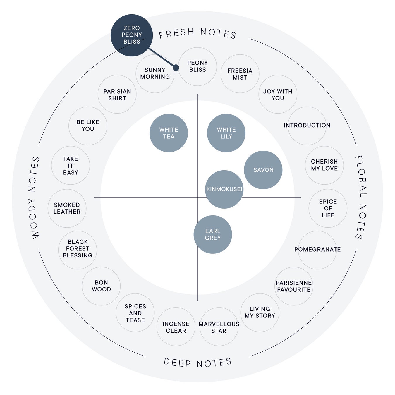 ゼロピオニー ブリスは、みずみずしいアップルとペアー、ピオニーなどの華やかな花々が奏でる、大人っぽくもピュアで可愛らしい香りです。そこに限定パフューム「WISHING YOU」のワインの深みと、「PARISIAN SHIRT」の柑橘とセージが重なることで、爽やかで力強いマリンの香りが美しく広がります。今ある香料を組み合わせることで、透明感と奥行きを兼ね備えたZERO COLLECTIONの新たな香りが完成しました。