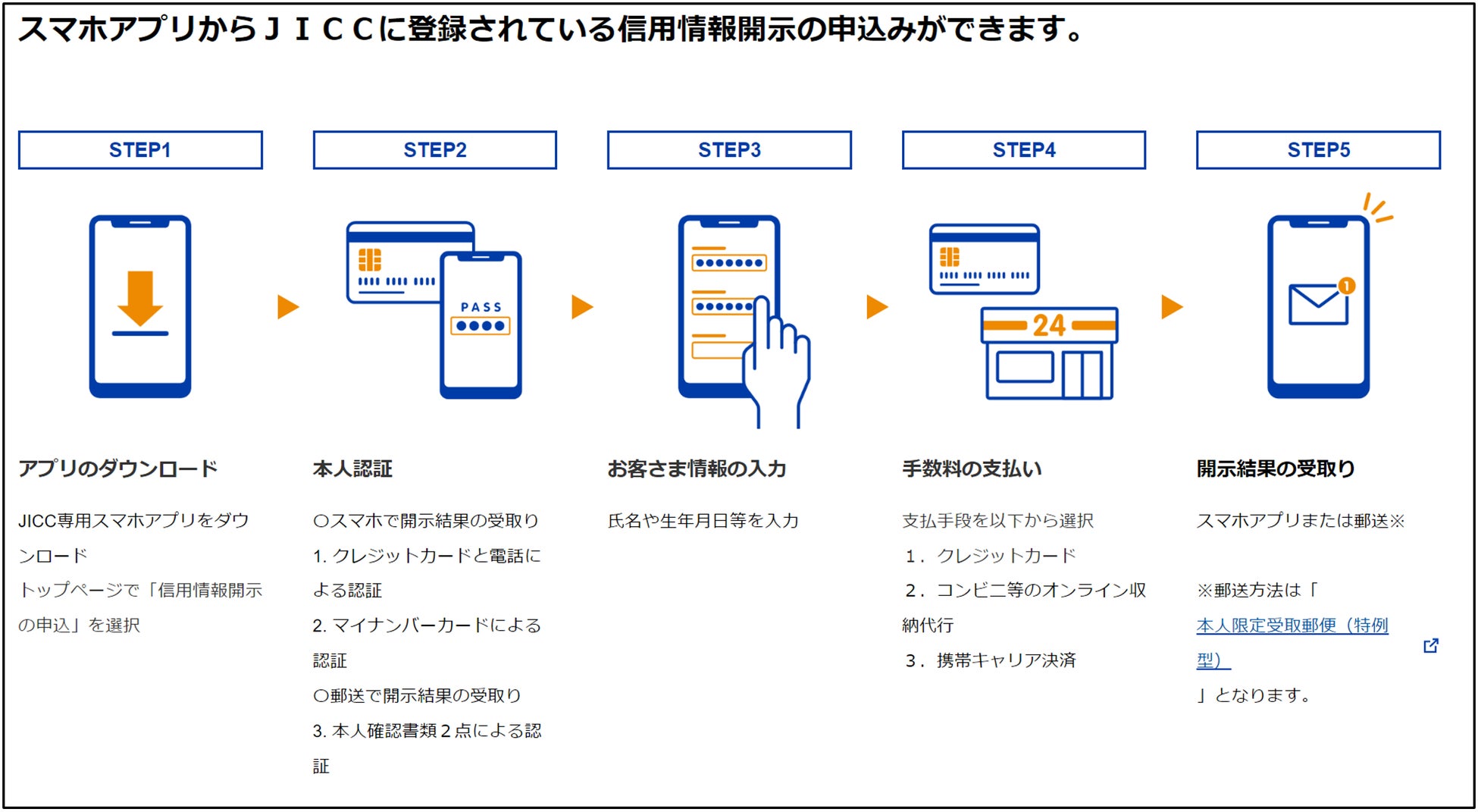 JICCのスマホアプリでは、ご自身の信用情報を安全・便利・迅速に確認することが可能です。登録されているローンやクレジット契約内容、支払状況などの詳細を簡単にチェックでき、申込情報の入力、本人確認、手数料のお支払いを経て開示結果が表示されます。また、本人確認書類等の紛失や盗難にあった旨を「本人申告コメント」としてJICCに登録でき、不正利用の未然防止にも役立ちます。