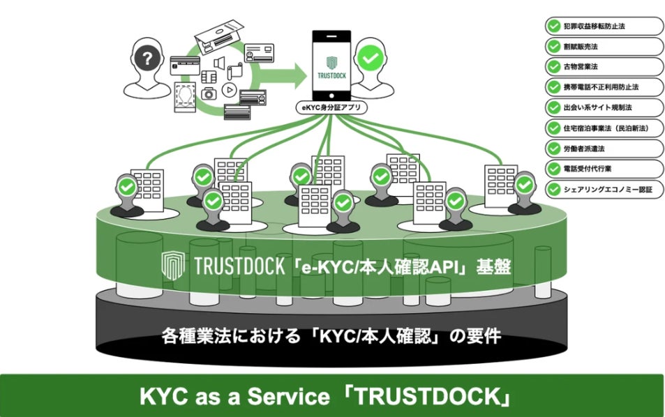 KYC as a Service「TRUSTDOCK」が提供している、デジタルIDウォレットとeKYC本人確認APIサービスでは、犯罪収益移転防止法をはじめ、携帯電話不正利用防止法、古物営業法、労働者派遣法、出会い系サイト規制法、民泊新法など、各種法律に準拠したKYCをAPI組み込みのみで実現します。