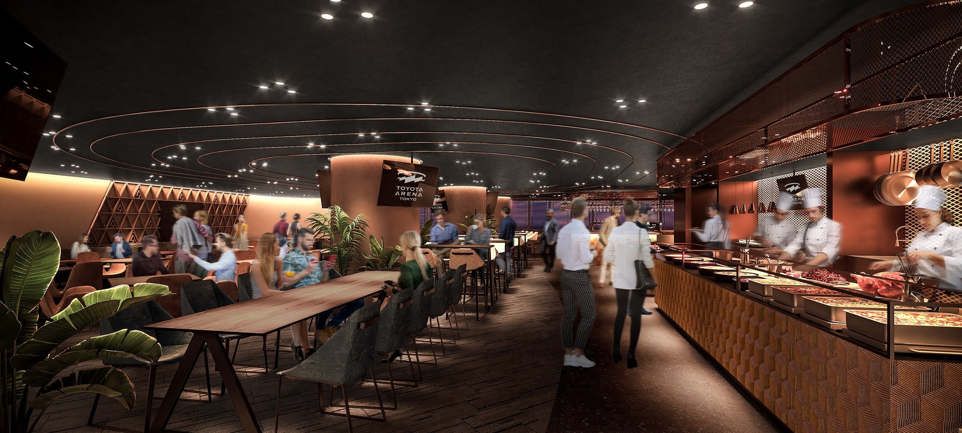 最高峰のエンターテインメント性を実現するために、国内最高精細のセンターハングビジョンと国内アリーナ初2層のリボンビジョン、さらには、個別制御可能な照明、原音に忠実で、狙った場所へ狙った音を正確に届けることができる高音質高性能スピーカーを設置しております。